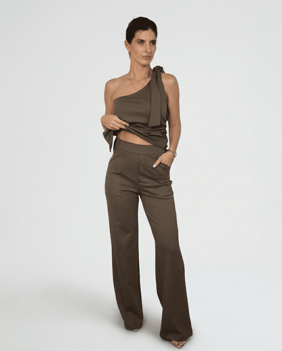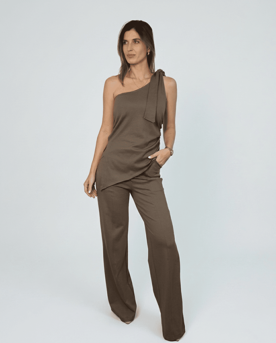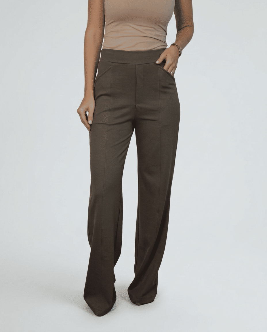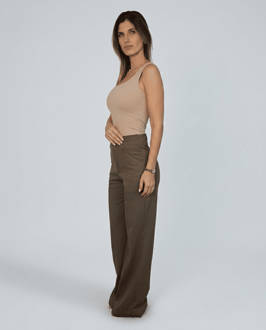 Sua modelagem reta e levemente ampla cria uma silhueta alongada e elegante, com caimento fluido que acompanha o movimento sem perder estrutura. Ela tem essa pegada social/alfaiataria. O vinco frontal desenha uma linha vertical precisa, trazendo sofisticação imediata e aquele efeito visual de alongamento que faz diferença no espelho - e mais ainda ao vivo.