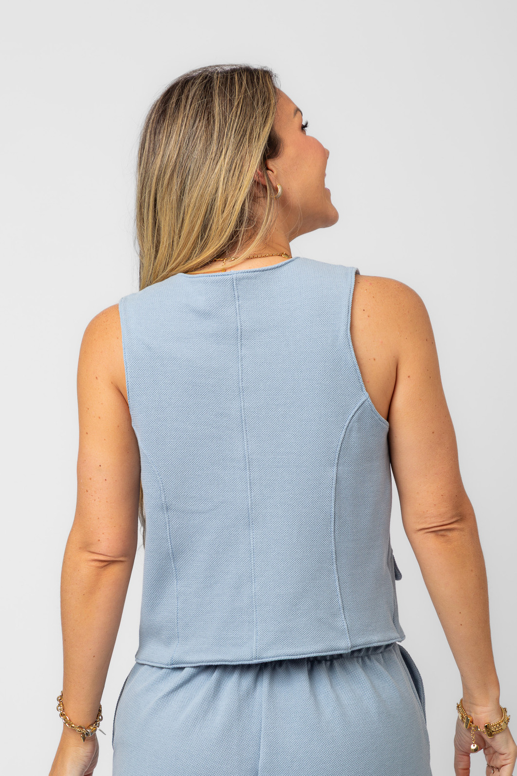 Modelagem precisa, toque de verão e charme atemporal. O Colete Milão traduz o novo clássico da alfaiataria feminina: estruturado na medida, com recortes que desenham a silhueta e laços ajustáveis que unem o visual romântico ao contemporâneo.