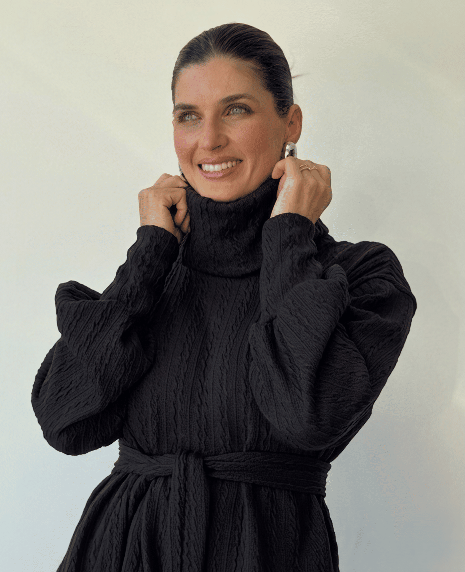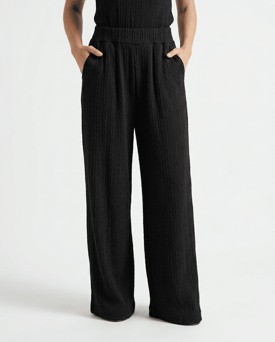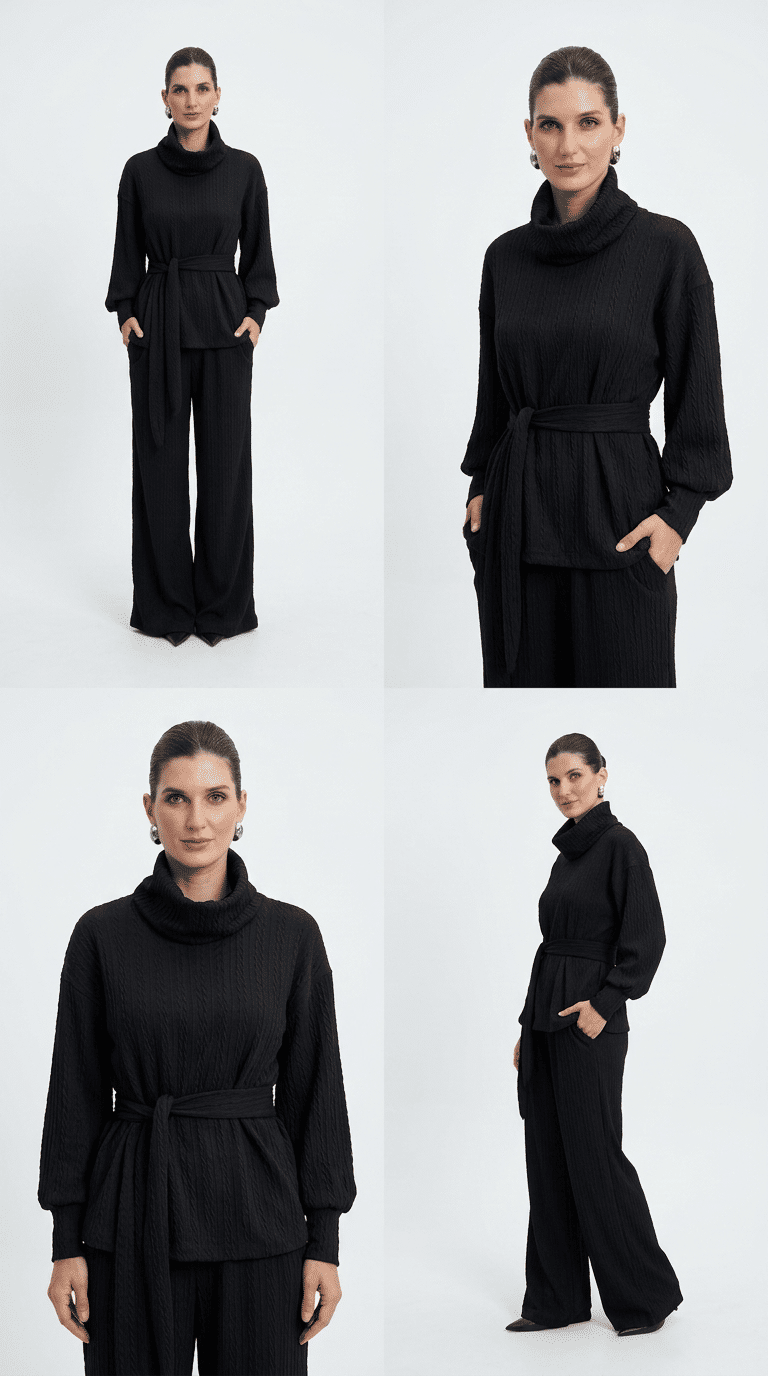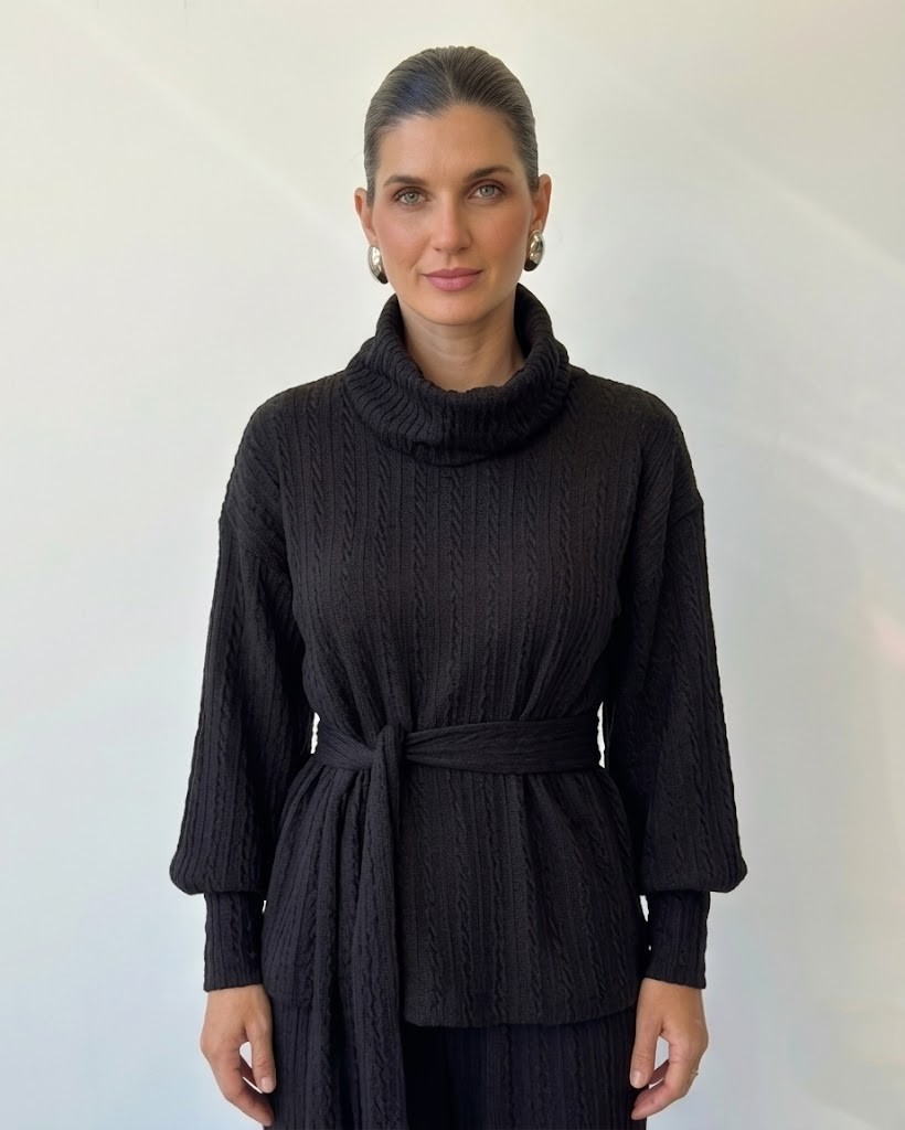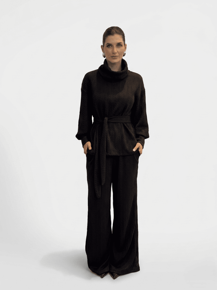 A textura do tecido aparece de forma contínua no conjunto, criando um visual rico sem exagero. A gola alta & estruturada traz destaque para a parte superior, enquanto a calça equilibra com sua fluidez.