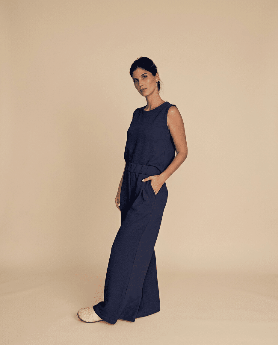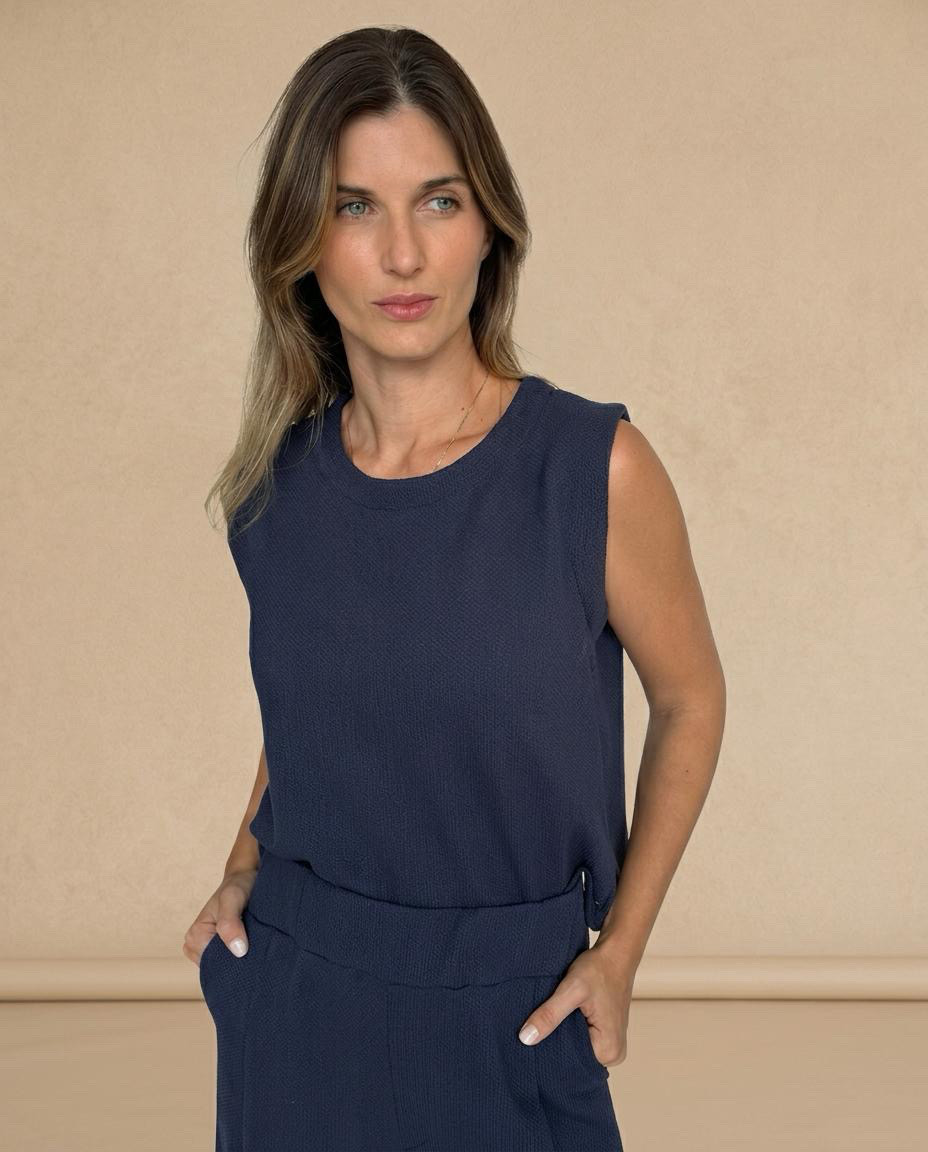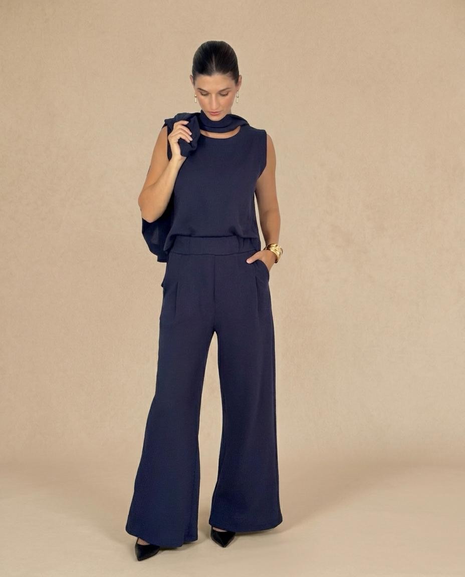 A blusa estrutura a parte superior com leveza, enquanto a calça alonga e traz fluidez. A textura presente nas duas peças cria unidade, resultando em um visual coeso e sofisticado.