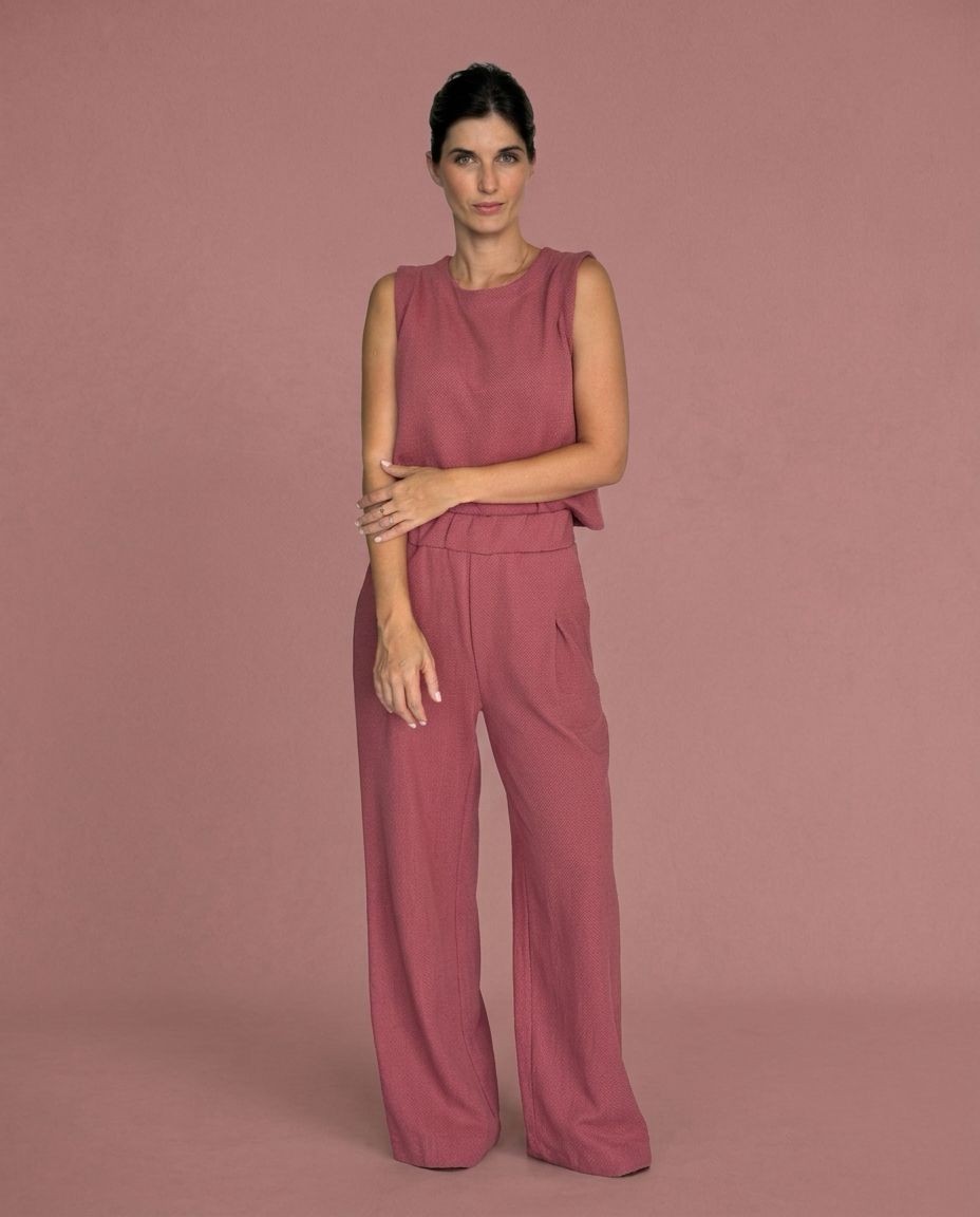 A blusa estrutura a parte superior com leveza, enquanto a calça alonga e traz fluidez. A textura presente nas duas peças cria unidade, resultando em um visual coeso e sofisticado.