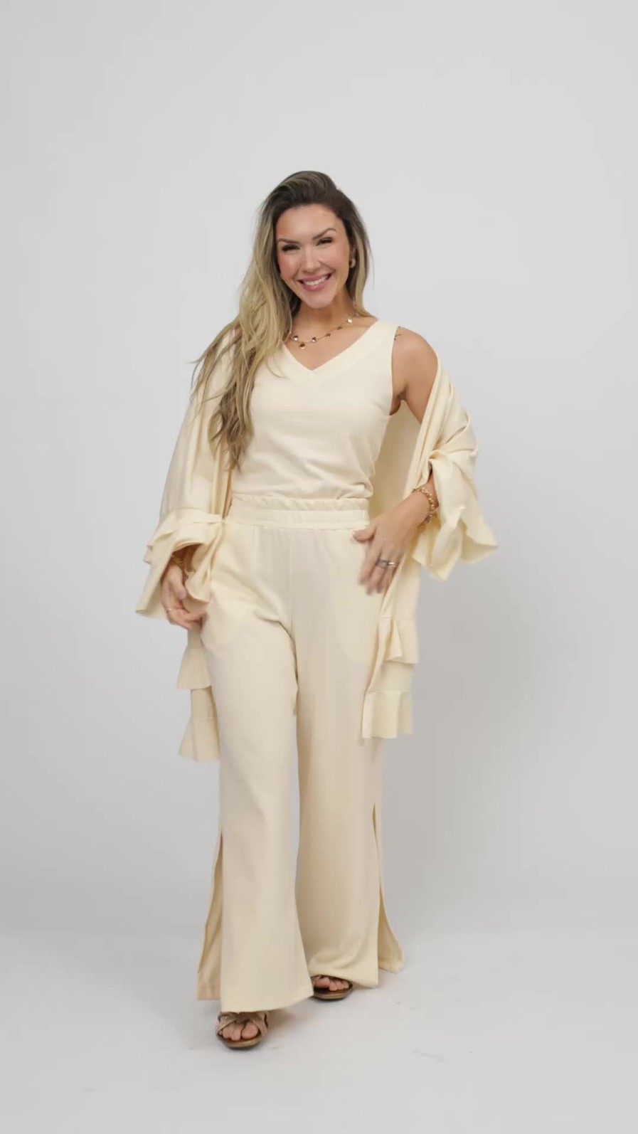 O Kimono Almar tem modelagem ampla, com estrutura reta e comprimento abaixo do quadril. A peça é aberta, sem fechamento, com mangas amplas e babado aplicado de forma contínua na barra, criando movimento ao caminhar. O recorte e o caimento foram pensados para gerar leveza visual e sensação de fluidez.