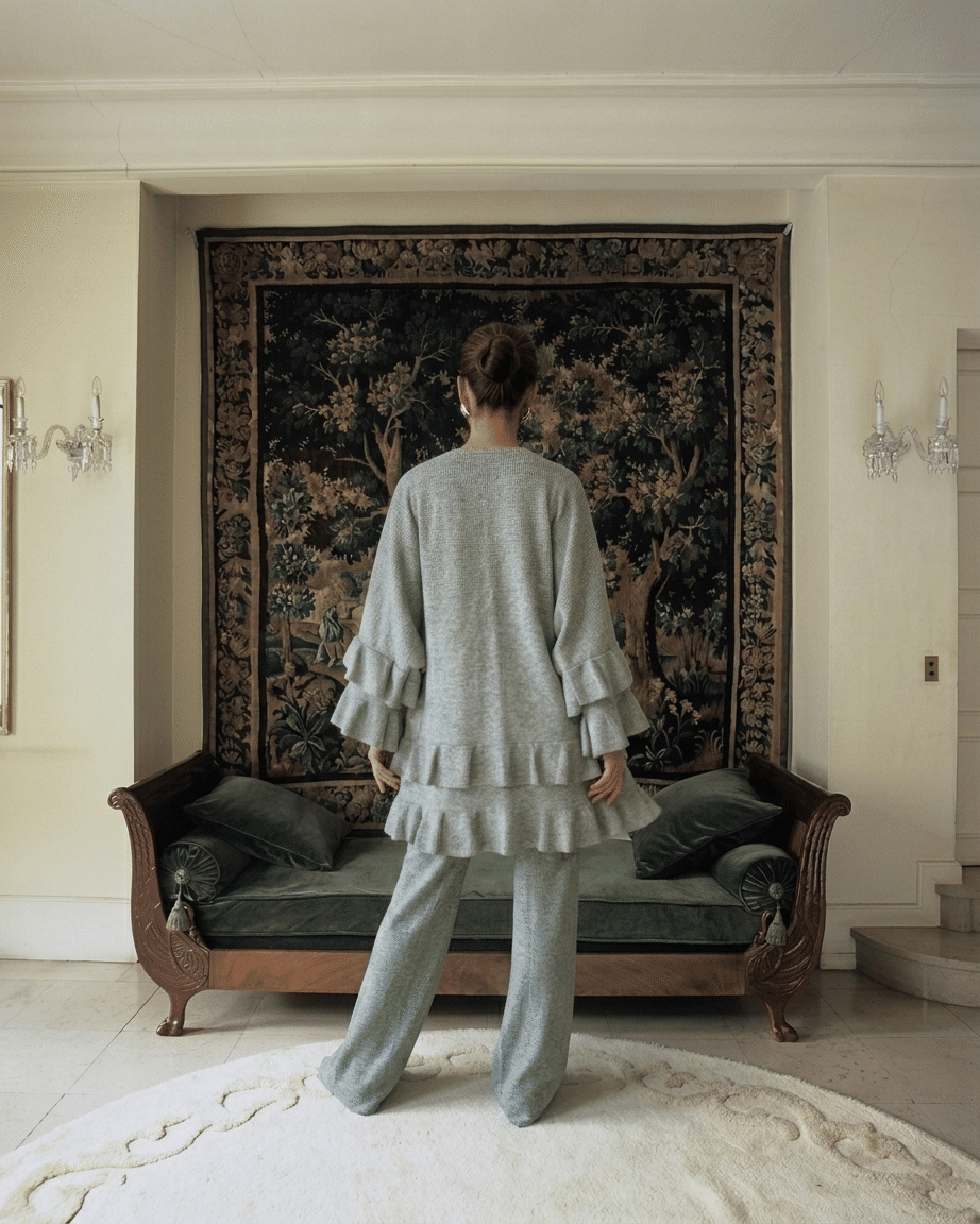 O grande destaque da peça está nos babados aplicados nas mangas e na barra, que criam camadas delicadas e movimento ao caminhar. Esse detalhe adiciona uma dimensão escultórica à peça, equilibrando romantismo e modernidade.