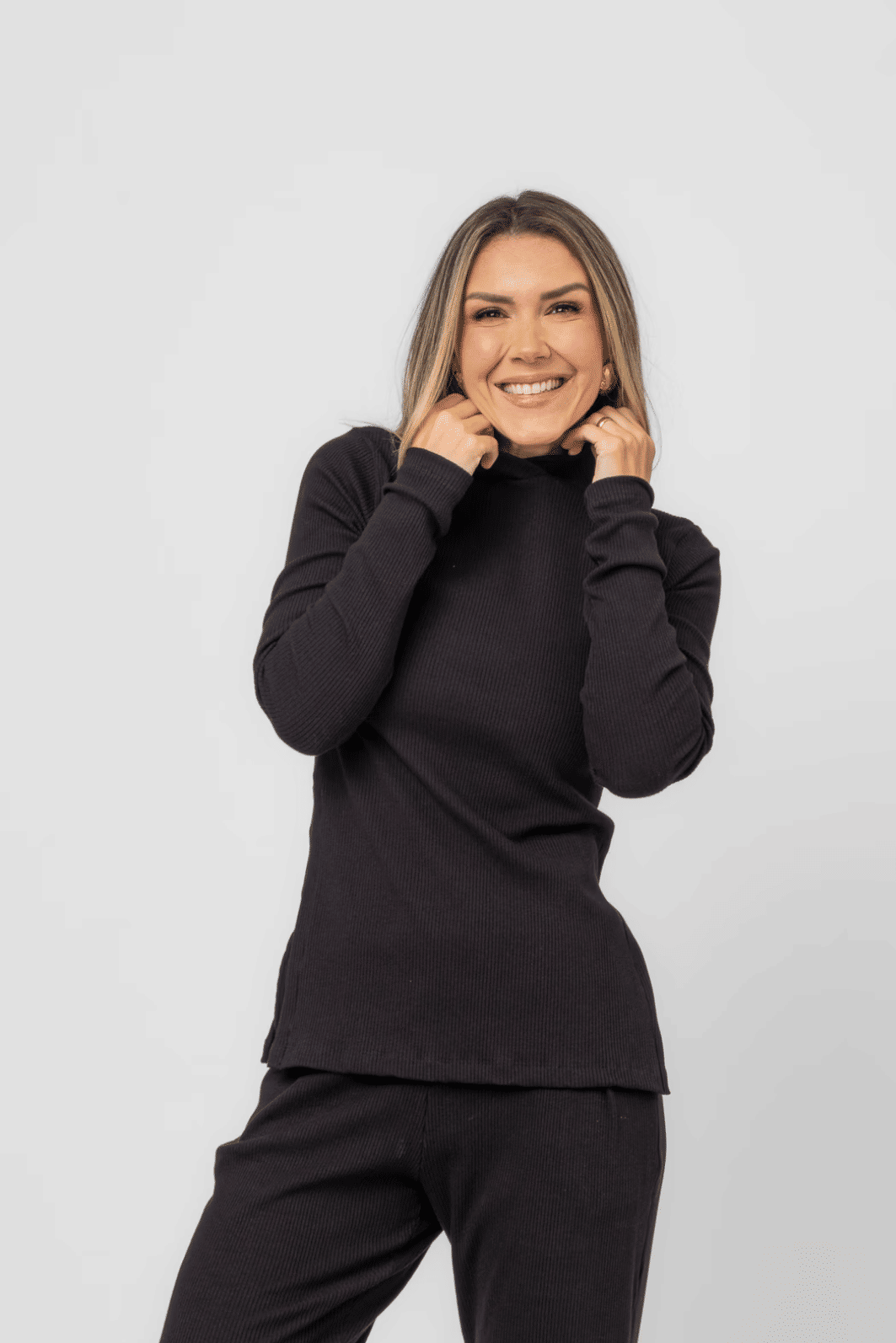 A gola alta assimétrica transforma a simplicidade em gesto de estilo, enquanto a modelagem ajustada e o comprimento alongado acompanham o corpo com suavidade, sem apertar. Um básico que sustenta o visual por si só.