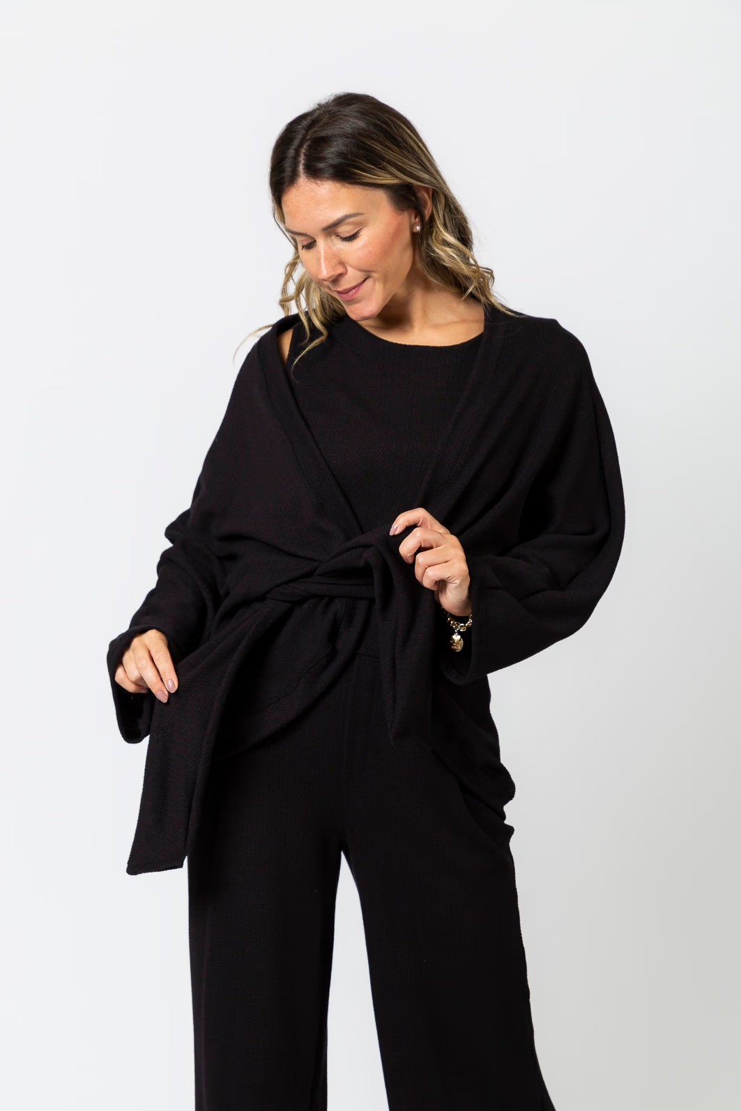 As três peças foram pensadas para funcionar juntas, criando um visual completo, limpo e sofisticado, mas também para serem usadas separadamente, ampliando as possibilidades do guarda-roupa.